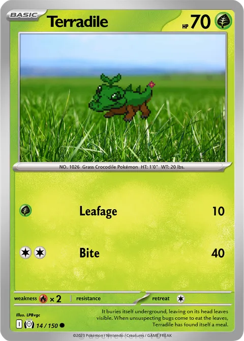 NO. 1026 Grass Crocodile Pokémon HT: 1'0" WT: 20 lbs.illus. LPBvgc#14/150It buries itself underground, leaving on its head leaves visible. When unsuspecting bugs come to eat the leaves, Terradile has found itself a meal.Created by @LPBvgc on 31 December 2024