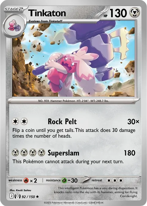 NO. 959 Hammer Pokémon HT: 2'04" WT: 248.7 lbs.illus. Kouki Saitou#92/150This intelligent Pokémon has a very daring disposition. It knocks rocks into the sky with its hammer, aiming for flying Corviknight.Created by @LPBvgc on 17 February 2025