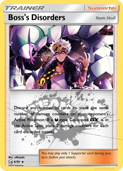 Discard any number of cards to place the same number of damage counters on your opponent's Active Pokémon. If a D-type Golisopod X is in the Active Spot, place 2 damage counters for each card discarded instead.