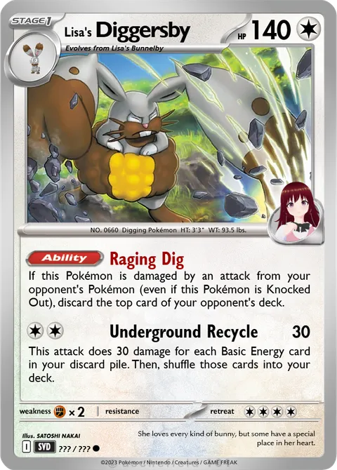 If this Pokémon is damaged by an attack from your opponent's Pokémon (even if this Pokémon is Knocked Out), discard the top card of your opponent's deck.Underground Recycle • 30×