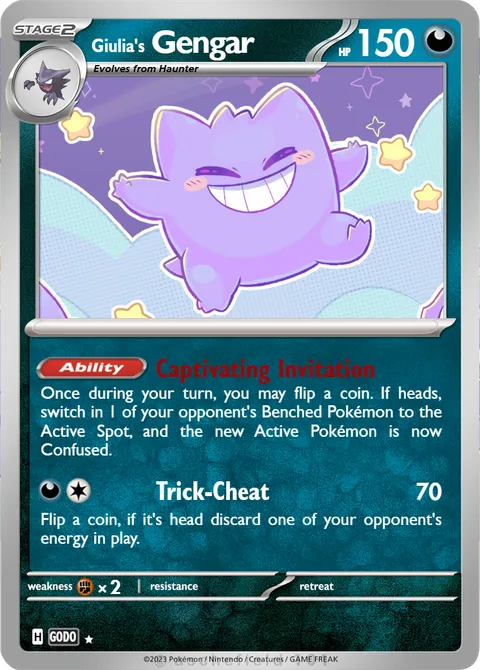 Once during your turn, you may flip a coin. If heads, switch in 1 of your opponent's Benched Pokémon to the Active Spot, and the new Active Pokémon is now Confused.Trick-Cheat • 70