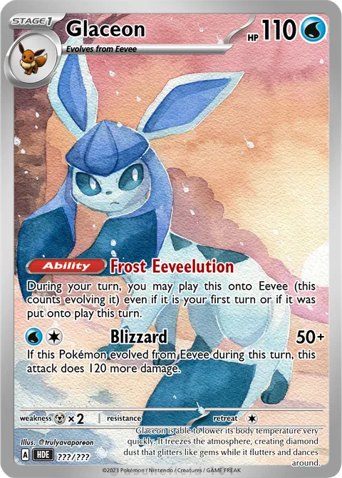 illus. @trulyavaporeon#???/???Glaceon is able to lower its body temperature very quickly. It freezes the atmosphere, creating diamond dust that glitters like gems while it flutters and dances around.Created by @MacJBreaks on 22 February 2026Includes assets by Creatures Inc.