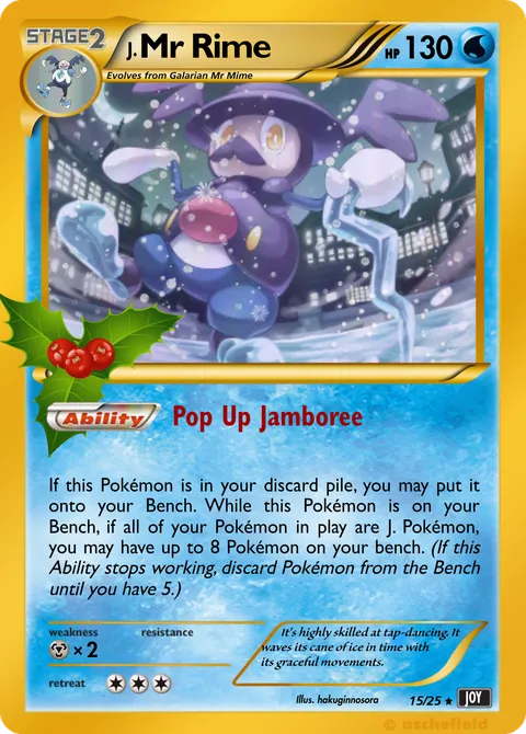 If this Pokémon is in your discard pile, you may put it onto your Bench. While this Pokémon is on your Bench, if all of your Pokémon in play are J. Pokémon, you may have up to 8 Pokémon on your bench. (If this Ability stops working, discard Pokémon from the Bench until you have 5.)Weakness: