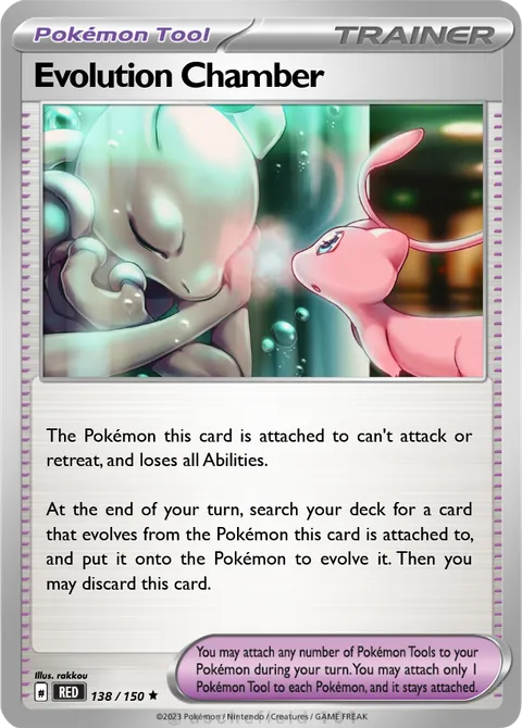 The Pokémon this card is attached to can't attack or retreat, and loses all Abilities. At the end of your turn, search your deck for a card that evolves from the Pokémon this card is attached to, and put it onto the Pokémon to evolve it. Then you may discard this card.
