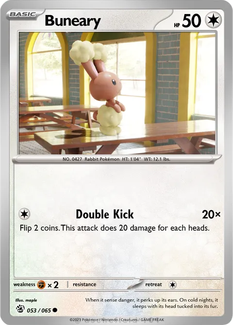NO. 0427 Rabbit Pokémon HT: 1'04" WT: 12.1 lbs.illus. maple#053/065When it sense danger, it perks up its ears. On cold nights, it sleeps with its head tucked into its fur.Created by @Maple on 23 September 2025