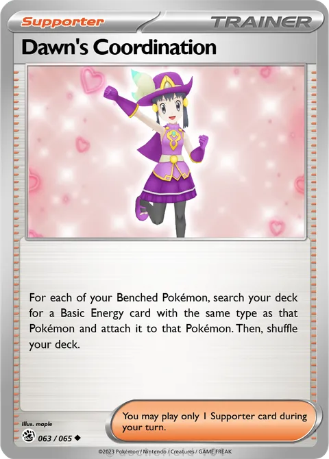 For each of your Benched Pokémon, search your deck for a Basic Energy card with the same type as that Pokémon and attach it to that Pokémon. Then, shuffle your deck.