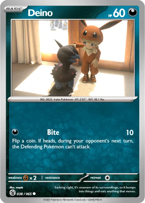 NO. 0633 Irate Pokémon HT: 2'07" WT: 38.1 lbs.illus. maple#038/065Lacking sight, it's unaware of its surroundings, so it bumps into things and eats anything that moves.Created by @Maple on 17 September 2025