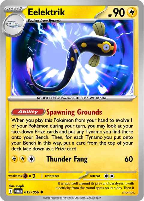 When you play this Pokémon from your hand to evolve 1 of your Pokémon during your turn, you may look at your face-down Prize cards and put any Tynamo you find there onto your Bench. Then, for each Tynamo you put onto your Bench in this way, put a card from the top of your deck face down as a Prize card.Thunder Fang • 60