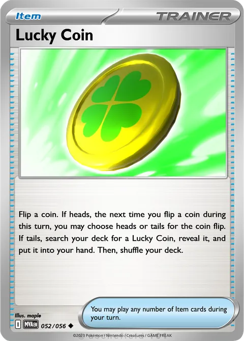 Flip a coin. If heads, the next time you flip a coin during this turn, you may choose heads or tails for the coin flip. If tails, search your deck for a Lucky Coin, reveal it, and put it into your hand. Then, shuffle your deck.