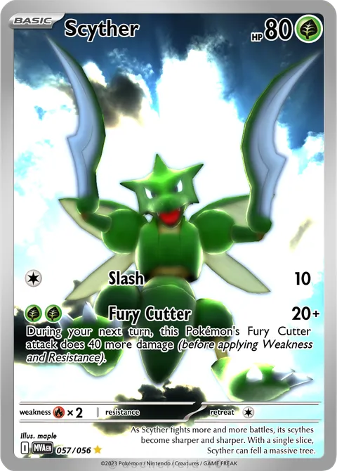 illus. maple#057/056As Scyther fights more and more battles, its scythes become sharper and sharper. With a single slice, Scyther can fell a massive tree.Created by @Maple on 02 February 2026Includes assets by Creatures Inc.