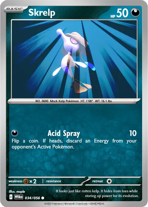 NO. 0690 Mock Kelp Pokémon HT: 1'08" WT: 16.1 lbs.illus. maple#034/056It looks just like rotten kelp. It hides from foes while storing up power for its evolution.Created by @Maple on 09 January 2026
