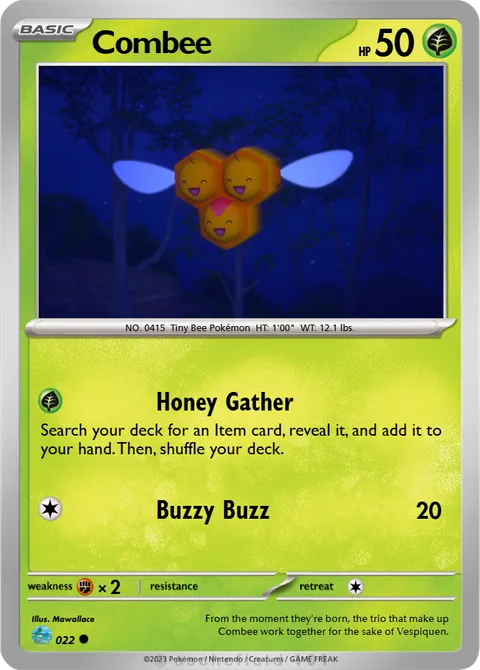 NO. 0415 Tiny Bee Pokémon HT: 1'00" WT: 12.1 lbs.illus. Mawallace#022From the moment they're born, the trio that make up Combee work together for the sake of Vespiquen.Created by @Mawallace116 on 22 July 2023