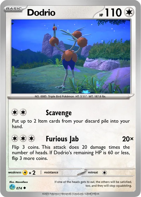 Flip 3 coins. This attack does 20 damage times the number of heads. If Dodrio's remaining HP is 60 or less, flip 3 more coins.