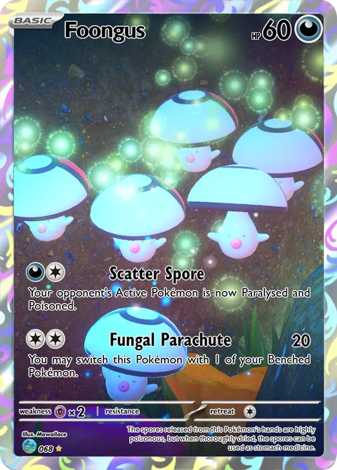 The spores released from this Pokémon's hands are highly poisonous, but when thoroughly dried, the spores can be used as stomach medicine.