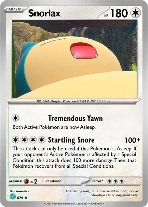 NO. 0143 Sleeping Pokémon HT: 6'11" WT: 1014.1 lbs.illus. Mawallace#079After eating roughly its own weight in food, Snorlax develops a truly king-sized belly.Created by @Mawallace116 on 14 August 2023
