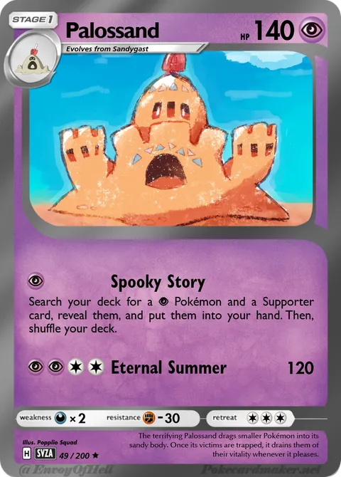 illus. Popplio Squad#49/200The terrifying Palossand drags smaller Pokémon into its sandy body. Once its victims are trapped, it drains them of their vitality whenever it pleases.Created by @MegaAmpharostheDragon on 30 September 2025