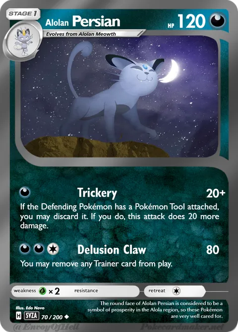 illus. Edo Novo#70/200The round face of Alolan Persian is considered to be a symbol of prosperity in the Alola region, so these Pokémon are very well cared for.Created by @MegaAmpharostheDragon on 28 September 2025