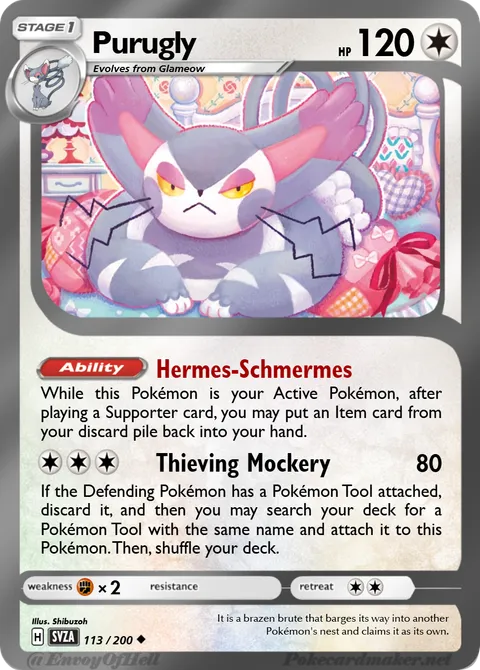 While this Pokémon is your Active Pokémon, after playing a Supporter card, you may put an Item card from your discard pile back into your hand.Thieving Mockery • 80