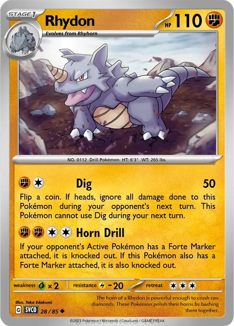 NO. 0112 Drill Pokémon HT: 6'3" WT: 265 lbs.illus. Taka Edakumi#28/85The horn of a Rhydon is powerful enough to crush raw diamonds. These Pokémon polish their horns by bashing them together.Created by @MegaAmpharostheDragon on 11 April 2025