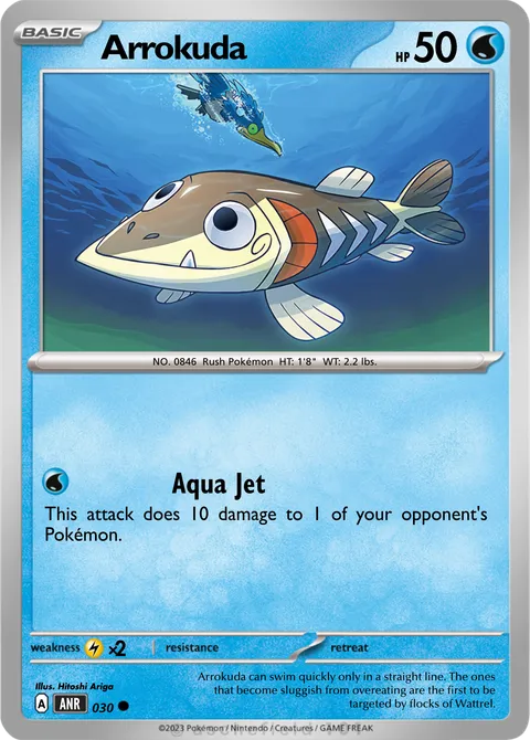 NO. 0846 Rush Pokémon HT: 1'8" WT: 2.2 lbs.illus. Hitoshi Ariga#030Arrokuda can swim quickly only in a straight line. The ones that become sluggish from overeating are the first to be targeted by flocks of Wattrel.Created by @Meltan808TCG on 01 September 2025.