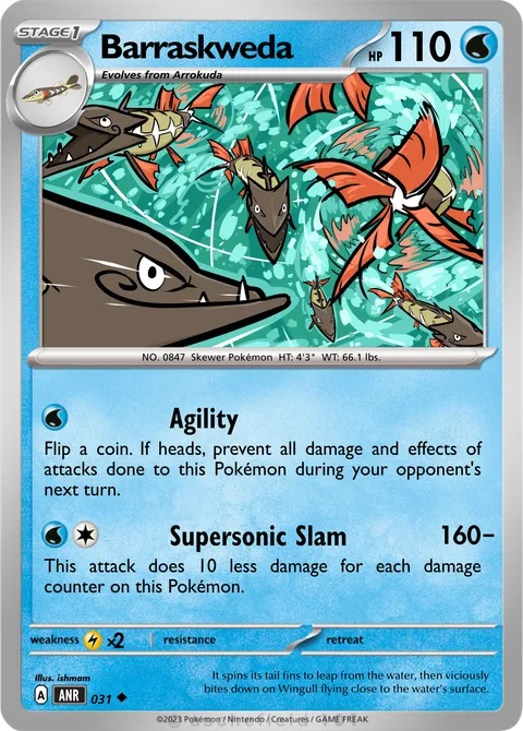 NO. 0847 Skewer Pokémon HT: 4'3" WT: 66.1 lbs.illus. ishmam#031It spins its tail fins to leap from the water, then viciously bites down on Wingull flying close to the water’s surface.Created by @Meltan808TCG on 01 September 2025.