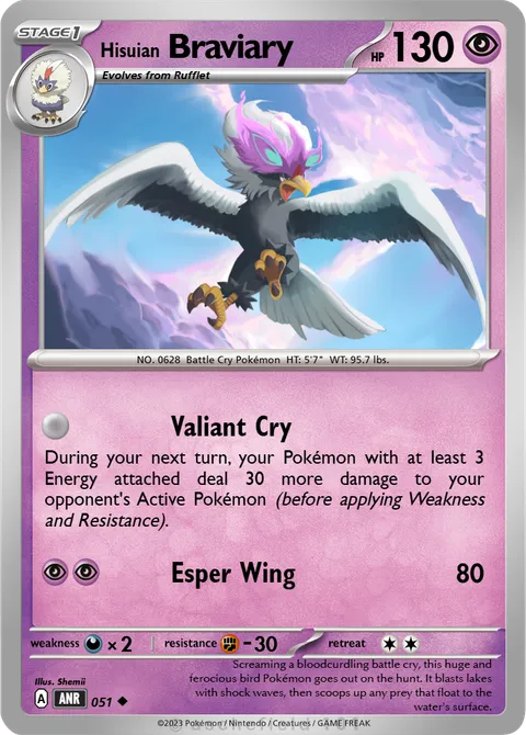 NO. 0628 Battle Cry Pokémon HT: 5'7" WT: 95.7 lbs.illus. Shemii#051Screaming a bloodcurdling battle cry, this huge and ferocious bird Pokémon goes out on the hunt. It blasts lakes with shock waves, then scoops up any prey that float to the water's surface.Created by @Meltan808TCG on 04 September 2025.