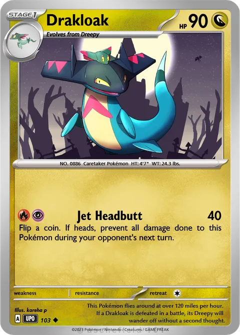 NO. 0886 Caretaker Pokémon HT: 4'7" WT: 24.3 lbs.illus. kareha p#103This Pokémon flies around at over 120 miles per hour. If a Drakloak is defeated in a battle, its Dreepy will wander off without a second thought.Created by @Meltan808TCG on 14 October 2025.