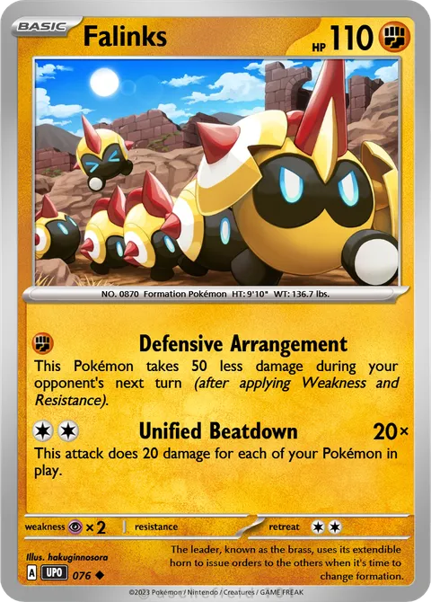 NO. 0870 Formation Pokémon HT: 9'10" WT: 136.7 lbs.illus. hakuginnosora#076The leader, known as the brass, uses its extendible horn to issue orders to the others when it's time to change formation.Created by @Meltan808TCG on 12 October 2025.