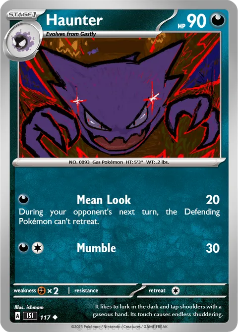 NO. 0093 Gas Pokémon HT: 5'3" WT: .2 lbs.illus. ishmam#117It likes to lurk in the dark and tap shoulders with a gaseous hand. Its touch causes endless shuddering.Created by @Meltan808TCG on 13 November 2025.