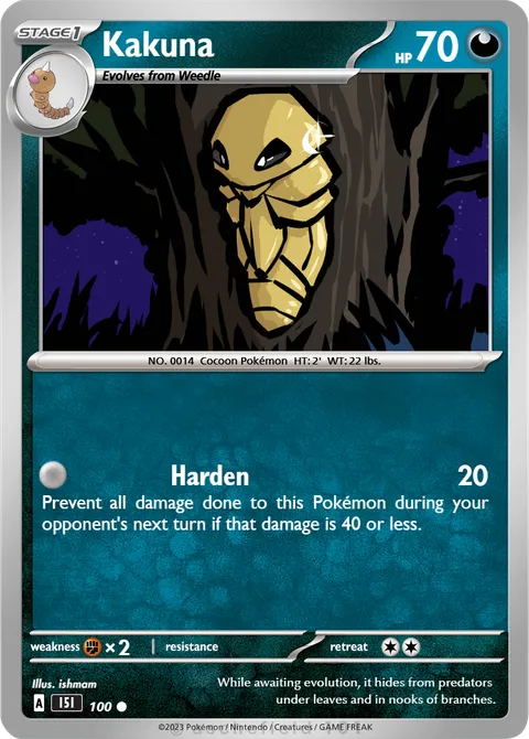 NO. 0014 Cocoon Pokémon HT: 2' WT: 22 lbs.illus. ishmam#100While awaiting evolution, it hides from predators under leaves and in nooks of branches.Created by @Meltan808TCG on 12 November 2025.