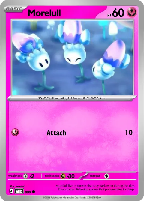 Morelull live in forests that stay dark even during the day. They scatter flickering spores that put enemies to sleep.
