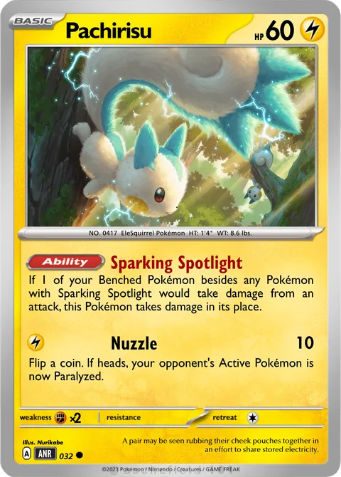 If 1 of your Benched Pokémon besides any Pokémon with Sparking Spotlight would take damage from an attack, this Pokémon takes damage in its place.Nuzzle • 10