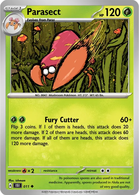 NO. 0047 Mushroom Pokémon HT: 3'3" WT: 65 lbs.illus. ishmam#011Its poisonous spores are also used in traditional medicine. Apparently, spores produced in Alola are not of very good quality.Created by @Meltan808TCG on 28 October 2025.