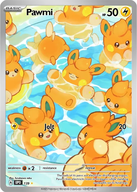 The pads of its paws are electricity-discharging organs. Pawmi fires electricity from its forepaws while standing unsteadily on its hind legs.