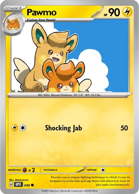 NO. 0922 Mouse Pokémon HT: 1'4" WT: 14.3 lbs.illus. blacknirrow#049Pawmo uses a unique fighting technique in which it uses its forepaws to strike foes and zap them with electricity from its paw pads simultaneously.Created by @Meltan808TCG on 04 October 2025.
