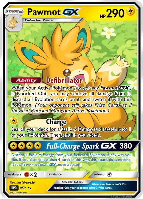 When your Active Pokémon (except any Pawmot-X) is Knocked Out, you may remove all damage from it, discard all Evolution cards on it, and switch it with this Pokémon. (Your opponent still takes Prize Cards as if they had Knocked Out your Active Pokémon.)Charge