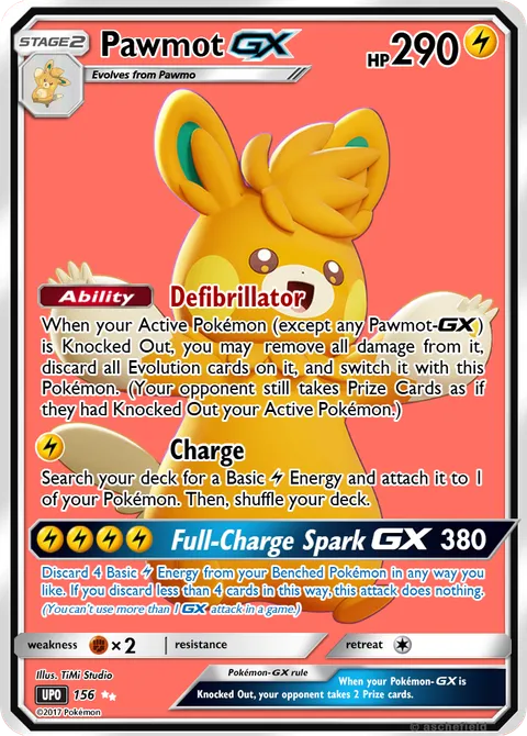 When your Active Pokémon (except any Pawmot-X) is Knocked Out, you may remove all damage from it, discard all Evolution cards on it, and switch it with this Pokémon. (Your opponent still takes Prize Cards as if they had Knocked Out your Active Pokémon.)Charge
