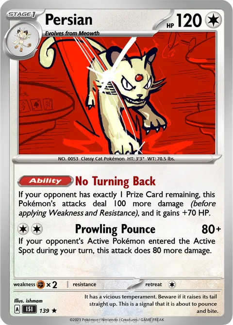 If your opponent has exactly 1 Prize Card remaining, this Pokémon's attacks deal 100 more damage (before applying Weakness and Resistance), and it gains +70 HP.Prowling Pounce • 80+
