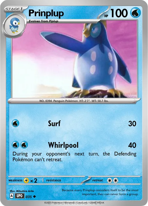 NO. 0394 Penguin Pokémon HT: 2'7" WT: 50.7 lbs.illus. Mitsuhiro Arita#035 Because every Prinplup considers itself to be the most important, they can never form a group.Created by @Meltan808TCG on 02 October 2025.