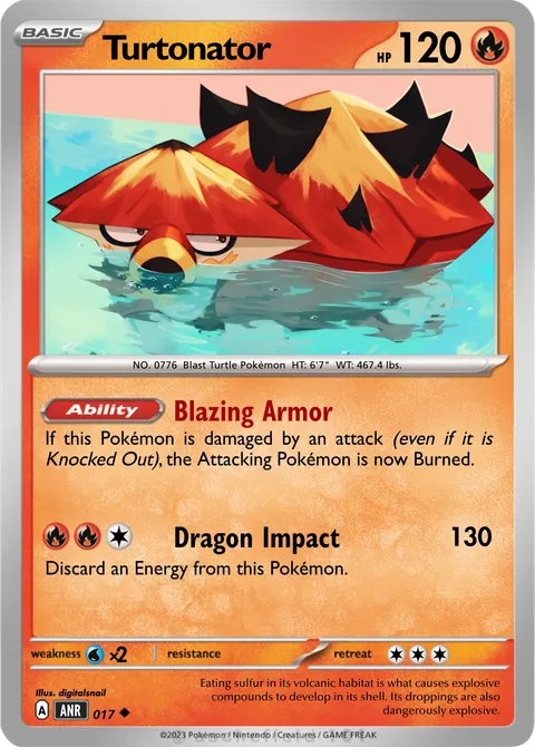 If this Pokémon is damaged by an attack (even if it is Knocked Out), the Attacking Pokémon is now Burned.Dragon Impact • 130
