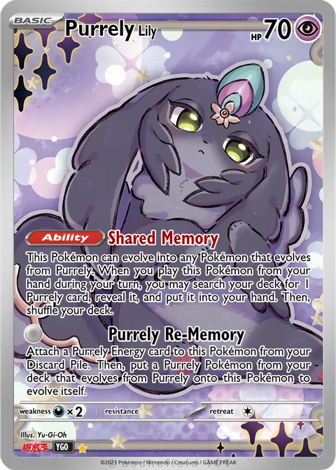 This Pokémon can evolve into any Pokémon that evolves from Purrely. When you play this Pokémon from your hand during your turn, you may search your deck for 1 Purrely card, reveal it, and put it into your hand. Then, shuffle your deck.Purrely Re-Memory