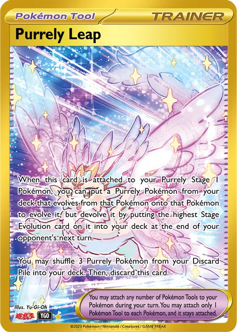 When this card is attached to your Purrely Stage 1 Pokémon, you can put a Purrely Pokémon from your deck that evolves from that Pokémon onto that Pokémon to evolve it, but devolve it by putting the highest Stage Evolution card on it into your deck at the end of your opponent's next turn. You may shuffle 3 Purrely Pokémon from your Discard Pile into your deck. Then, discard this card.