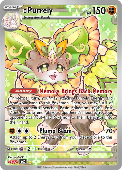 Thrice per turn, you may attach a Purrely Energy card from your hand to this Pokémon. Then, you may put 1 of your opponent's Benched Basic Pokémon to the Lost Zone. At the end of your opponent's next turn, your opponent can put that Pokémon to their Bench or into their hand.Plump Beam • 70