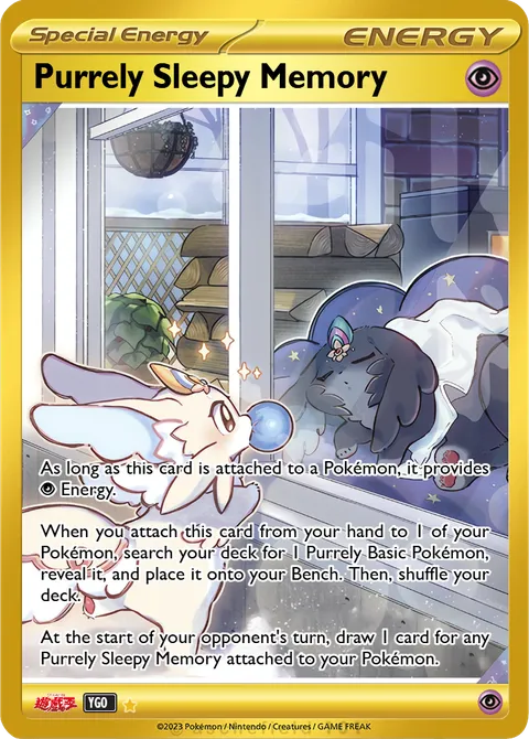 As long as this card is attached to a Pokémon, it provides P Energy. When you attach this card from your hand to 1 of your Pokémon, search your deck for 1 Purrely Basic Pokémon, reveal it, and place it onto your Bench. Then, shuffle your deck. At the start of your opponent's turn, draw 1 card for any Purrely Sleepy Memory attached to your Pokémon.