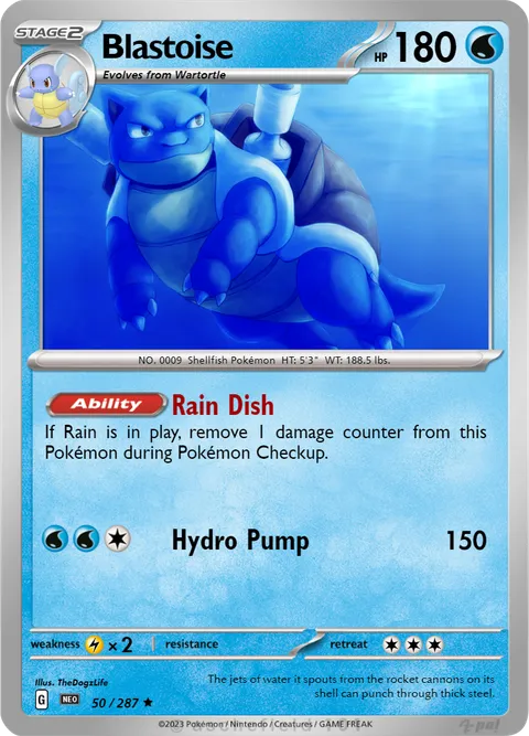 If Rain is in play, remove 1 damage counter from this Pokémon during Pokémon Checkup.Hydro Pump • 150