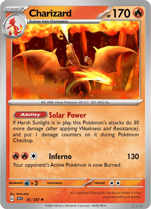 If Harsh Sunlight is in play, this Pokémon's attacks do 30 more damage (after applying Weakness and Resistance), and put 1 damage counters on it during Pokémon Checkup.Inferno • 130