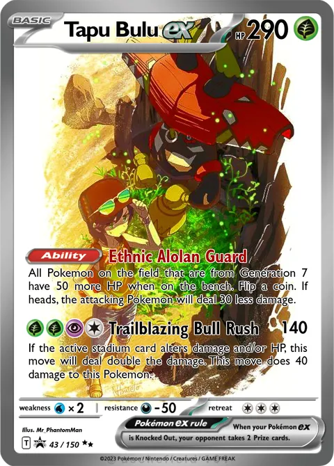 All Pokemon on the field that are from Generation 7 have 50 more HP when on the bench. Flip a coin. If heads, the attacking Pokemon will deal 30 less damage.Trailblazing Bull Rush • 140