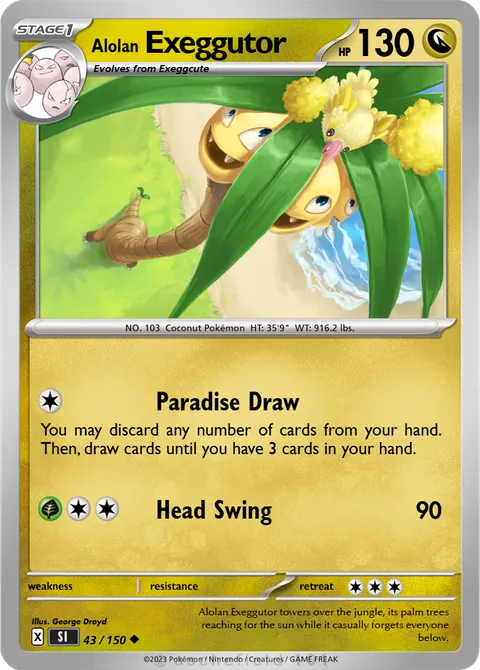 NO. 103 Coconut Pokémon HT: 35'9" WT: 916.2 lbs.illus. George Droyd#43/150Alolan Exeggutor towers over the jungle, its palm trees reaching for the sun while it casually forgets everyone below.Created by @Mrprinc3 on 13 February 2025