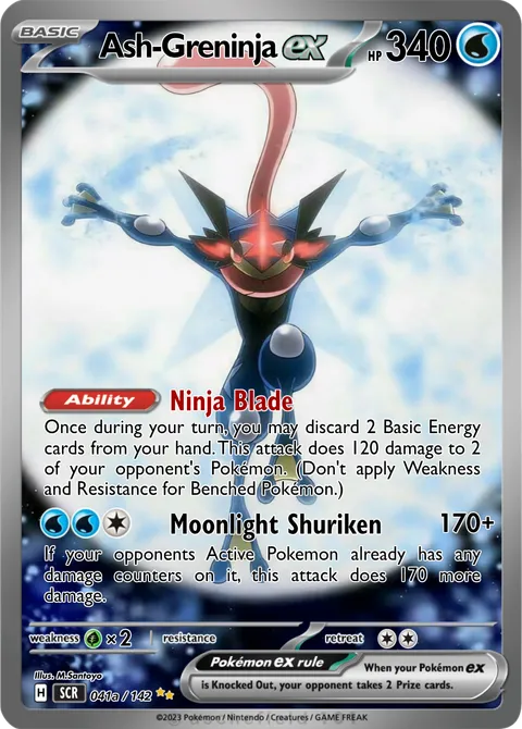 Once during your turn, you may discard 2 Basic Energy cards from your hand. This attack does 120 damage to 2 of your opponent's Pokémon. (Don't apply Weakness and Resistance for Benched Pokémon.)Moonlight Shuriken • 170+