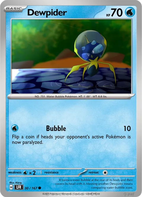 It forms a water bubble at the rear of its body and then covers its head with it. Meeting another Dewpider means comparing water-bubble sizes.